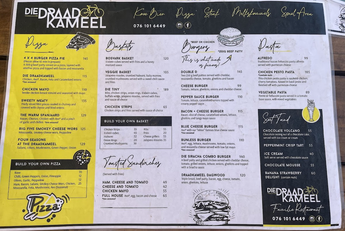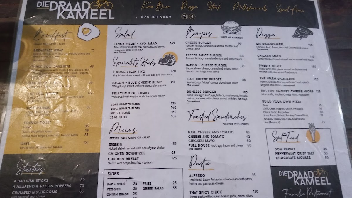 You’ll find a range of options including satisfying pizzas like the Draadkameel Pizza, robust meat dishes such as the 500g T-Bone with chips, and sharing plates like the generous 800g ribs served with mashed potatoes. These dishes complement the restaurant’s welcoming vibe, where the focus is on enjoying good food alongside approachable drinks—from classic Pina Coladas to refreshing vodka slushies.