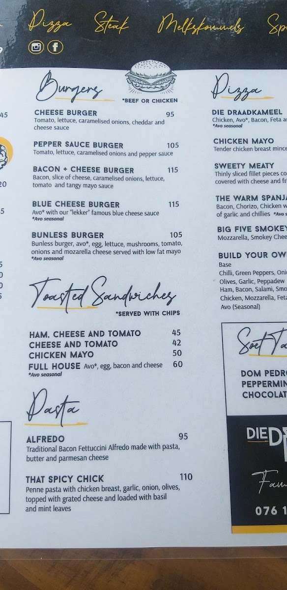 The menu at Die Draad Familie Restaurant offers a straightforward, comforting selection designed to suit a relaxed and convivial atmosphere. It features casual bites and hearty meals that feel just right for gathering with family or friends, whether you’re here for a lively evening with live music or a relaxed weekend lunch.
